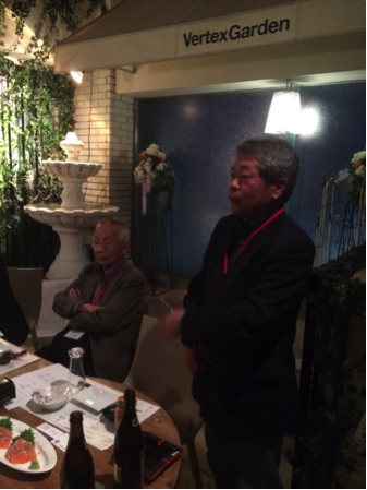 懇親会は、浅田事務局長の挨拶から始まり、大石滋先輩の挨拶・乾杯で、会の幕開けです。